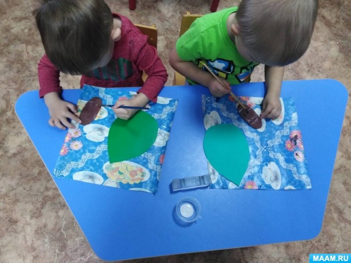 Младшая группа: готовые шаблоны -листок из зеленого картона, черные и красные кружочки разного размера из цветной бумаги, клей — карандаш, салфетки для примакивания.