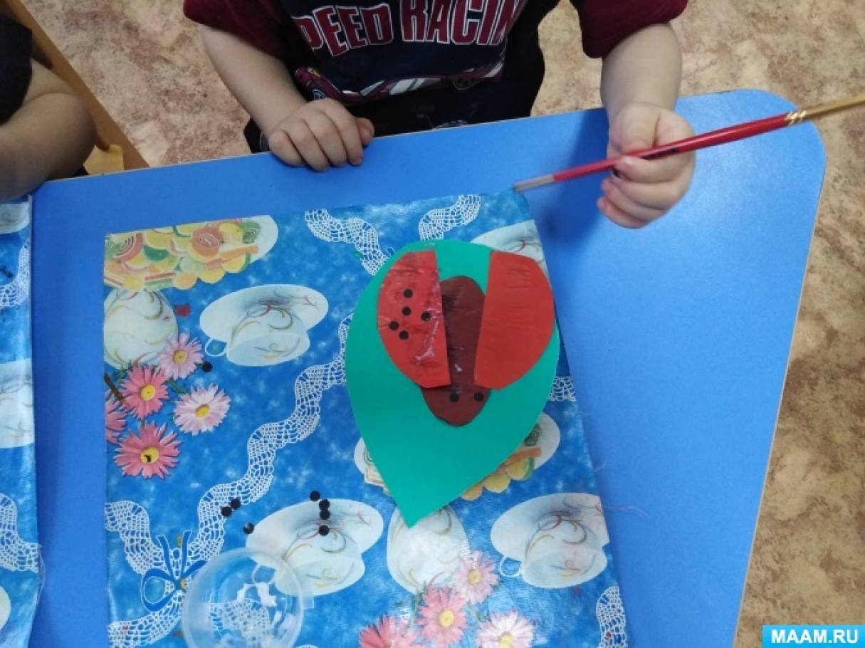 Воспитатель обращается к детям: — Мы с вами сегодня попробуем сделать божью коровку из бумаги. Для этого нам потребуется большой черный круг, который приклеим на зеленый листок, где будет сидеть наша божья коровка.