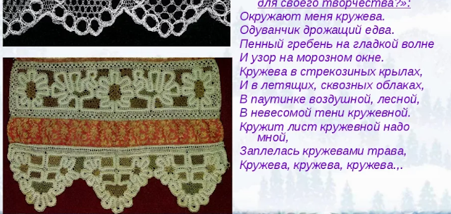 Рисунки мастериц напоминают морозные узоры, а концы кружевных шалецй- крылья сказочных птиц…