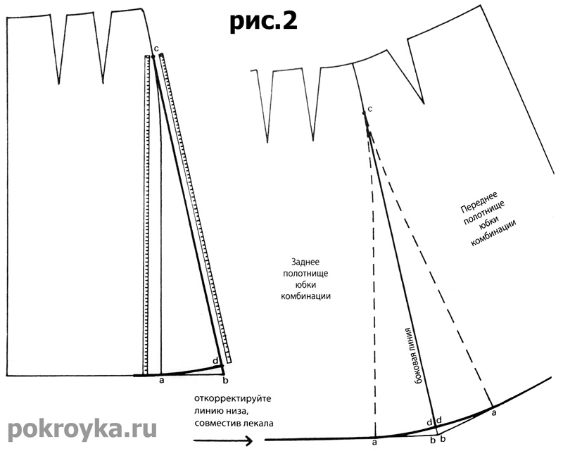 2. Уменьшите ширину спинки у боковой линии: по подмышечной линии на 1,2 см, по завышенной линии талии на 0,5 см. Начертите верхний участок боковой линии спинки комбинации от подмышечной линии до линии обхвата бедер верхнего через полученные точки. Расширьте спинку комбинации по низу на 5 см. Измерьте длину боковой линии базовой конструкции платья от точки на линии обхвата бедер верхнего до линии низа комбинации. Начертите нижний участок боковой линии комбинации полученной длины от точки на линии обхвата бедер верхнего до линии низа комбинации с учетом ее расширения (см. илл. 2).